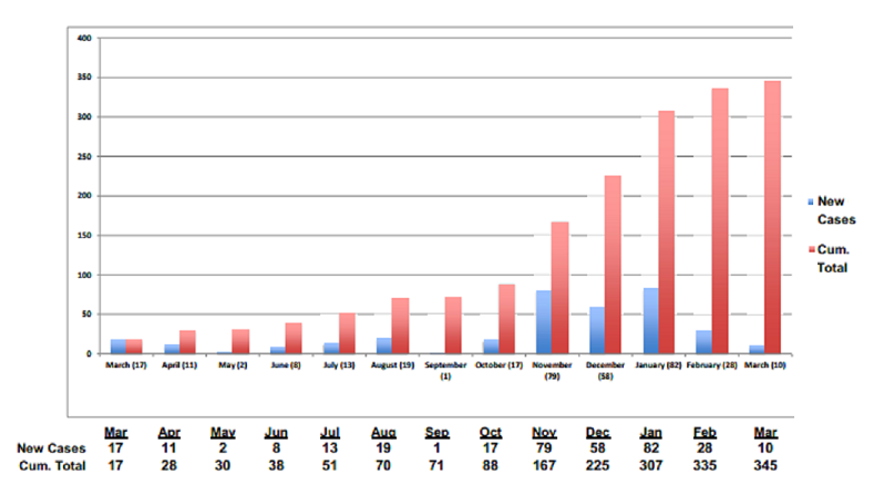As of March 31, 2021 the total number of COVID-19 cases in Jefferson County was 345. There were only 10 cases in March, down significantly from the spike of 79 last November.