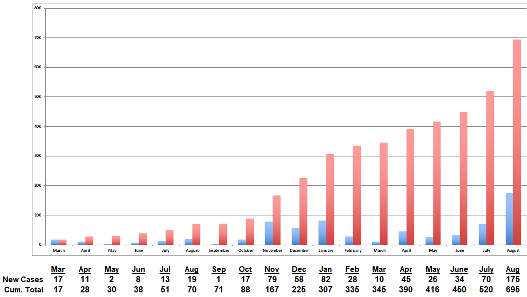 The 175 additional cases in August are more than twice the number in any previous month (there were 82 in January 2021 and 79 in November 2020). In just one month, these 175 new cases account for 25 percent of all 695 cases recorded in Jefferson County. It is believed that the actual number is higher, but many people who use home testing kits do not report the results to the local health department.