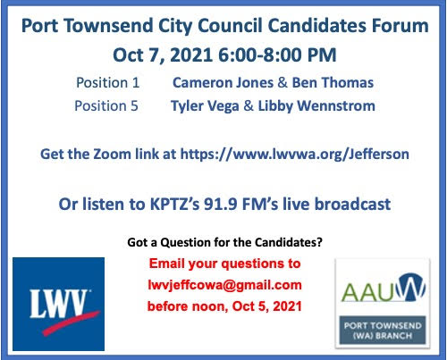 Anyone unable to attend the October 7 Port Townsend City Council Candidates Forum can now view the video of the candidates for Position 1: Cameron Jones and Ben Thomas – and Position 5: Tyler Vega and Libby Wennstrom – via a link posted at https://www.lwvwa.org/Jefferson or on YouTube at https://www.youtube.com/watch?v=uG2mNm241u8. The League of Women Voters encourages all voters to watch the forum, view the candidates’ websites, and read their responses to written questions on Vote411.org prior to voting.